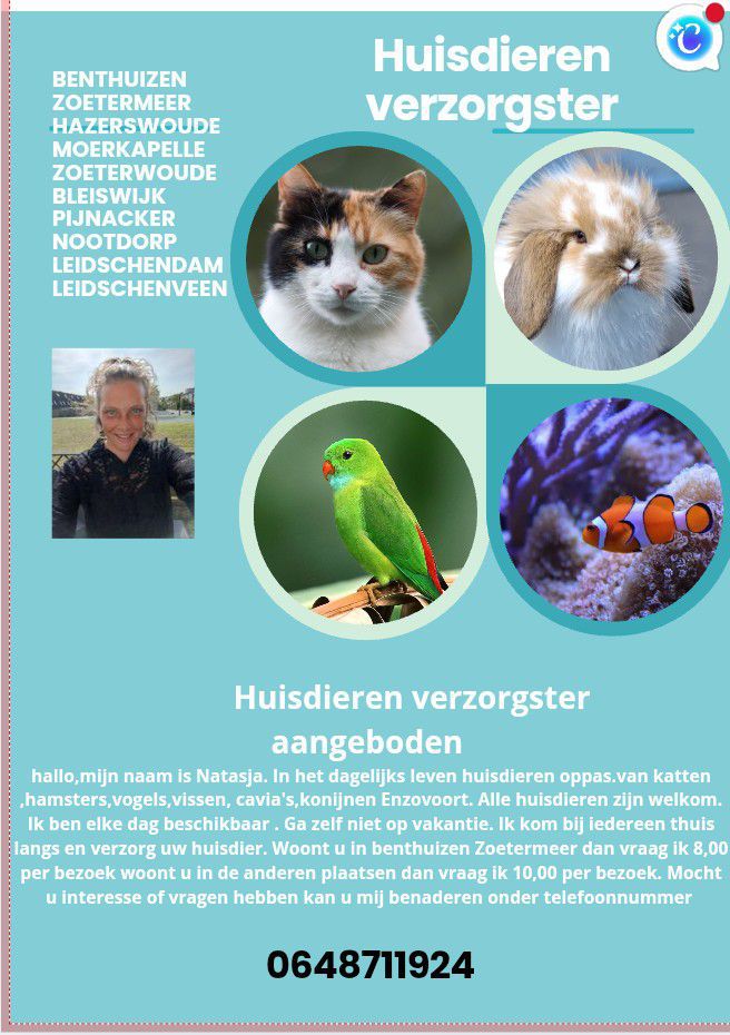 Voor dieren ben ik oppas aan jullie huis dit door heel Zoetermeer en omstreken zie op de foto's waar allemaal .