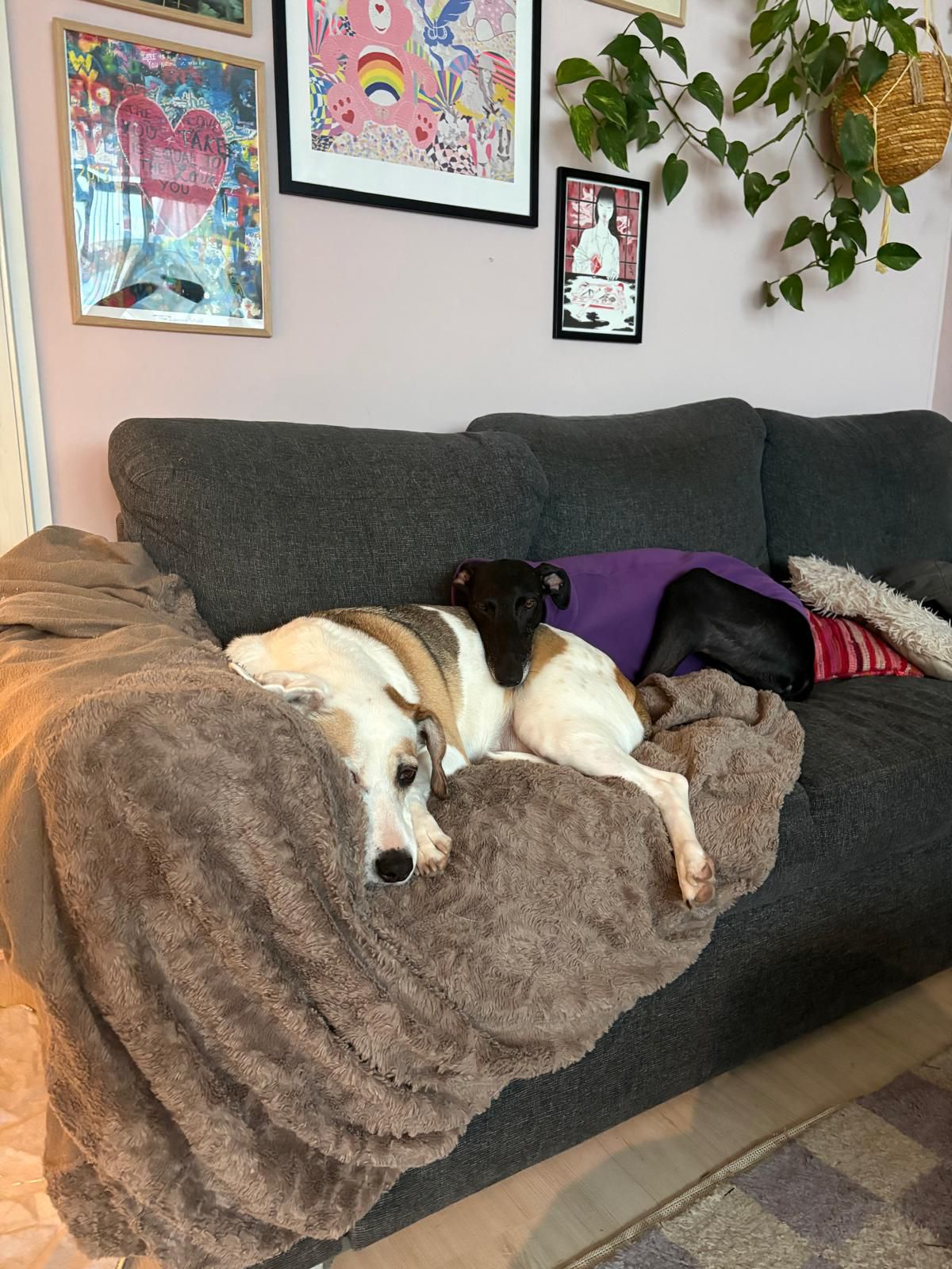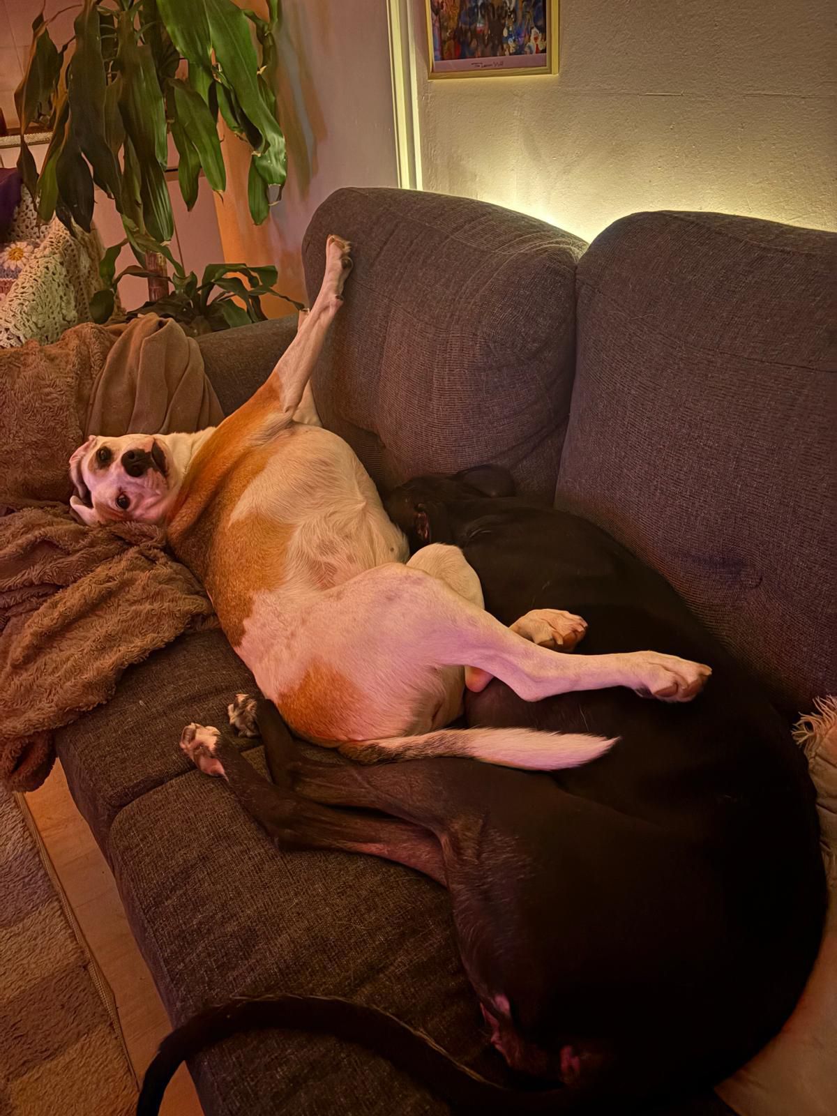 Mijn beide honden zijn geadopteerd vanuit Spanje. Mara is 8 jaar en 6 jaar bij mij en Pia is bijna 3 jaar en sinds mei 2025 bij mij. Beide zijn thuis lekker rustig en liggen graag in hun mand, op de bank of op elkaar te luieren. Mara is een beetje te dik, dus zij zit aan het dieetvoer, dus voor haar proberen we extra veel te lopen. Dat vinden ze allebei erg leuk gelukkig. Mara mag ook los in losloopgebieden zoals het Mastbos en de Galderse meren.