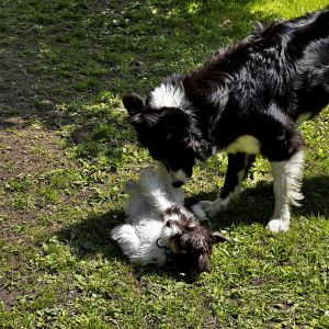 Beer kan goed met andere honden. Omdat hij nog aan het wisselen is hem alleen laten met kleine kinderen nog niet verstandig. Naar kinderen is hij super lief en hij speelt graag met ze.